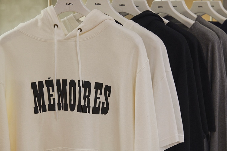 こちらが〈Mémoires〉のタイトルフォント。 UEではシンプルかつシンボリックに配したフーディやニット、Tシャツなどを展開。 |