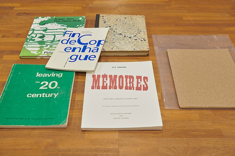 HFが長年かけて集めたというアスガー・ヨルンの作品集の数々。 右端の紙やすりの表紙が〈Mémoires〉の初版で、 シチュアショニスト関連の作品を多く扱っているパリの古書店で購入したものだとか。 |