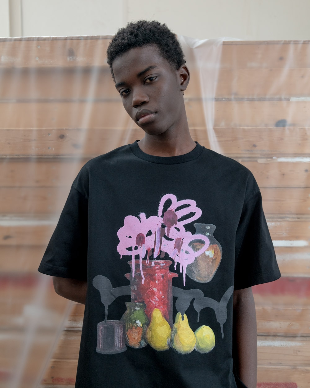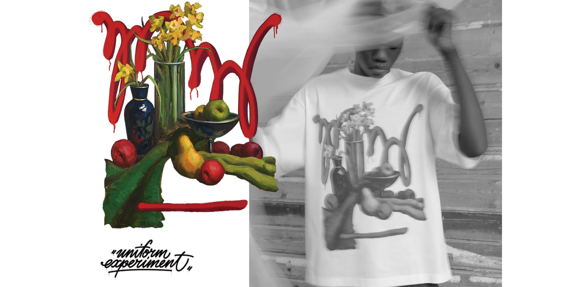 古典絵画技法とグラフィティアートの融合によって、伝統への敬意と反骨精神が共存する「アカデミック・ヴァンダリズム」を、実験的なプロダクトメイキングを標榜するuniform experimentのウェアに投影したコレクションです。