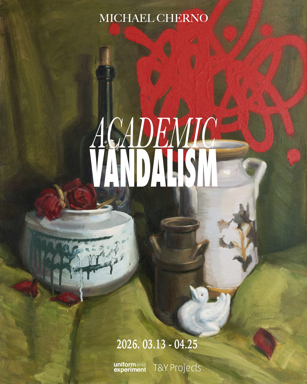 Q5. 2018年のトロント移住後にマイケルさんが見出した「アカデミック・ヴァンダリズム」とは具体的にどのような芸術のスタイルなのでしょうか。アカデミック・ヴァンダリズムとは、私にとって等しく重要な二つの世界の衝突。それが私自身のスタイルであり、個人的な哲学でもあります。「アカデミック」には、大学やアカデミーでの訓練、技術的なルール、そして祖父の仕事や父の物語から受け継いだ文化的記憶など私が人生で吸収してきた全てが詰まっている。その積み重ねられた規律をキャンバスに注ぎ込み、そして数秒で破壊する。その行為こそが私にとっては自由そのもの。また過去の私ーグラフィティ・ストリート・本能ーと、現在の私ー絵画・技術・制御ーを繋ぎ、そして私を魅了するゲーム的な要素でもあるのです。 Q6. 「アカデミック・ヴァンダリズム」においてマイケルさんが最も大切にしている描写の技法やポリシーとは。基礎は常に古典的。構図、色彩論理、そして絵画の内部バランス。人々はグラフィティの色彩がランダムだと誤解しがちだが、そうなることは稀で、私はその意識を自身の作品に持ち込む。場合によっては将来の“破壊行為”のための余地を作るため、意図的に“不正確な”静物構図を構築することもある。色彩もまた核心的。同じ構造を保ちつつ、ひとつの色を変えるだけで絵画全体が全く異なる物語へと変わります。 |